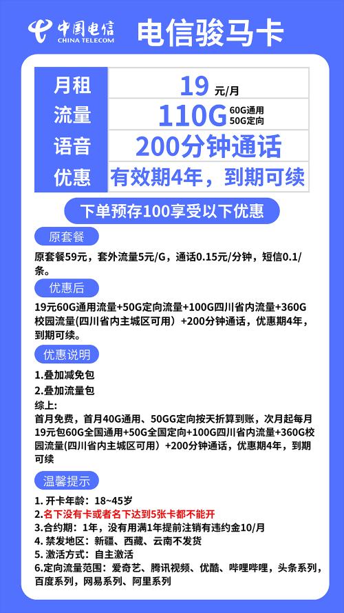 ✅✅电信长期19元110G+200分钟