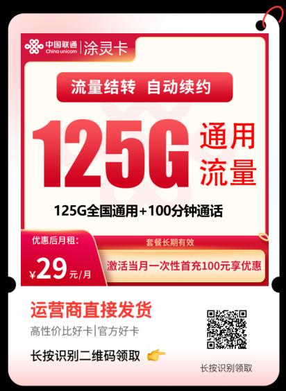 ✅✅联通长期29元125G流量结转+100分钟